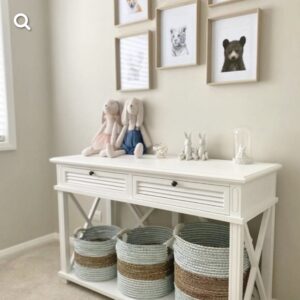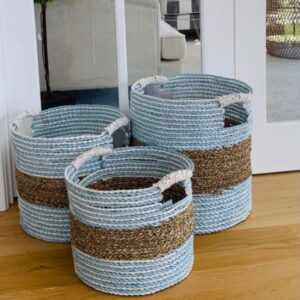 HAMPTONS SET OF 3 – BLUE/WHITE HAMPTON’S BASKETS Dimensions – H41cm x 61cm – H32x56 – H27x52 Weight – 6kg Material – Sea Grass, Raffia,Plastic Arrives fully assembled Rattan, cane or sea grass  is a timeless example of a Hampton’s … Read More