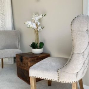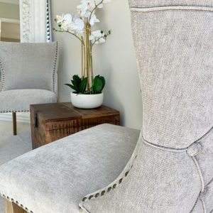 OCCASIONAL BUTTON BACK CHAIR Dimensions -58 W x 60 D x 80 H (floor to seat 45cm) Material – Soft chenille linen, Oak legs Filling – Solid timber frame, foam Seat Colour – Soft light grey Plush button back occasional … Read More -
