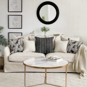HAMPTONS ROUND MARBLE & IRON COFFEE TABLE Dimensions: W100cm D100cm H50cm Materials: Iron and Marble Colour – Gold base, marble top Product Weight: 23kg The perfect Hamptons style home with the striking gold base contrasting beautifully with the marble top. … Read More -