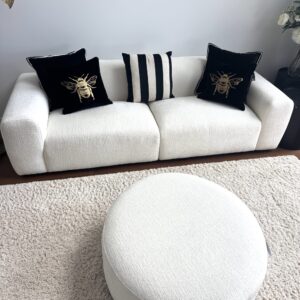 ROUND BOUCLE OTTOMAN Dimensions – W 90 x D 90 x H 36 Material – Boucle Fabric 100% Polyester Filling – High Density Foam, Oak Base, Wood Framing, Colour – Warm White Assembly – Yes – Legs need to be … Read More -