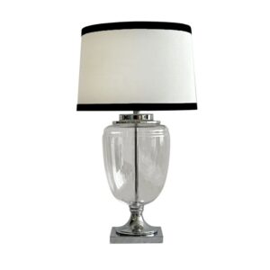 Charlotte Glass & Nickle Lamp With White Linen Shade (Black Trim) SIZE -W43 x D43 x H78.5cm Material – Glass/Iron/Linen Colour – Clear/Nickel/Natural Base/Light Fixture Material Details: Plated Iron & Glass Product Weight – 4.5kg Switch Type: On/Off Switch Switch … Read More -