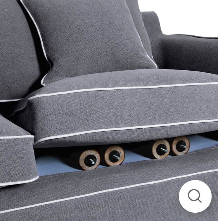 This beautiful warm grey with white piping Hampton’s style slip cover sofa oozes the wow and comfort factor. Spare covers are also available along with the matching armchair.\