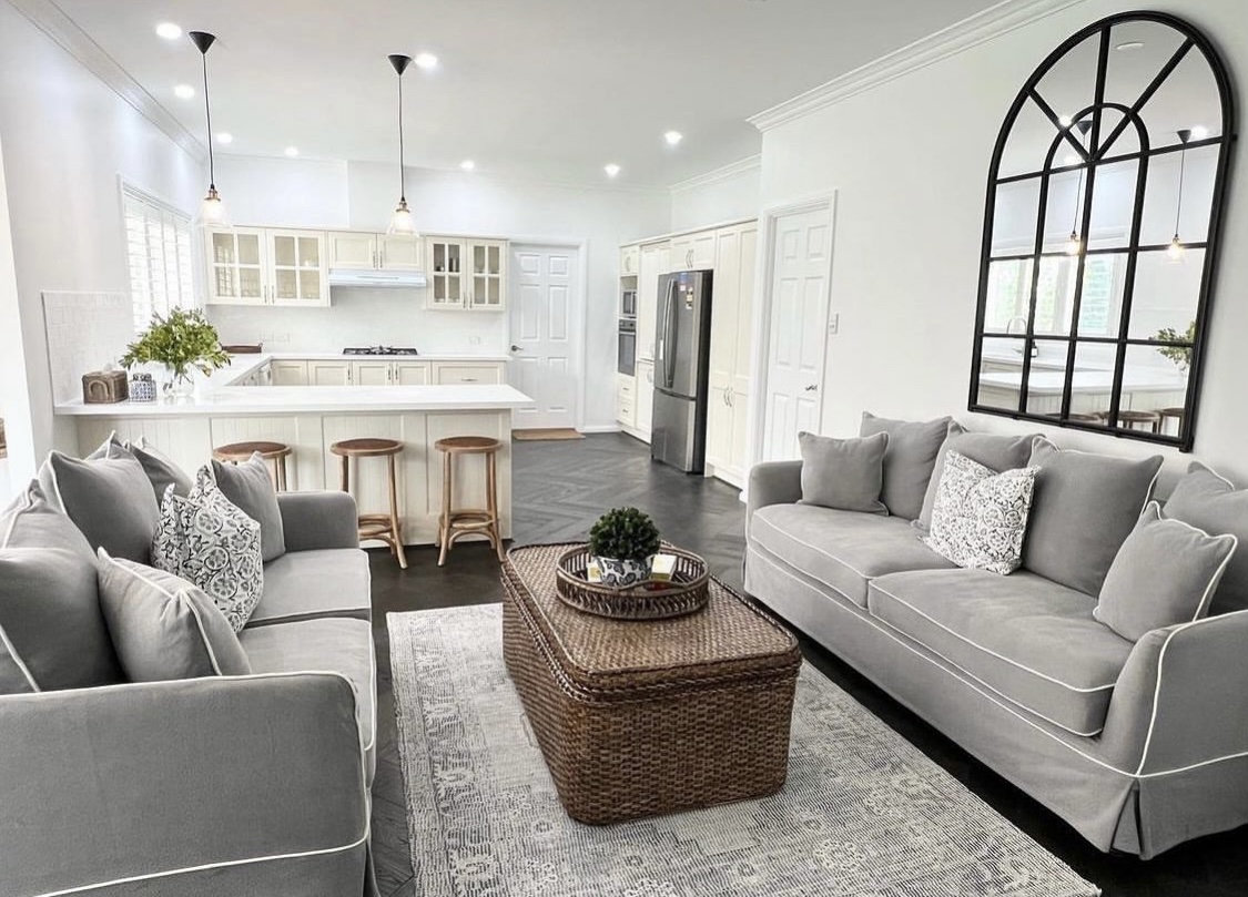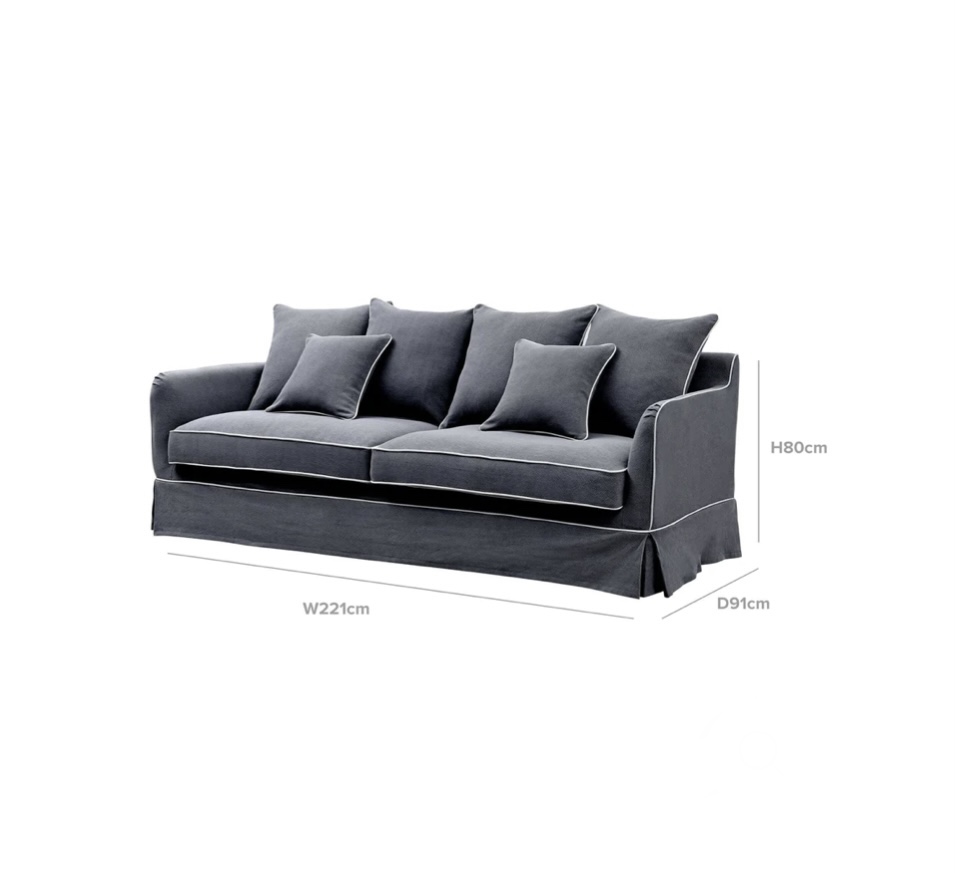 This beautiful warm grey with white piping hamptons style slip cover sofa oozes the wow and comfort factor. Spare covers are also available along with the matching arm chair.