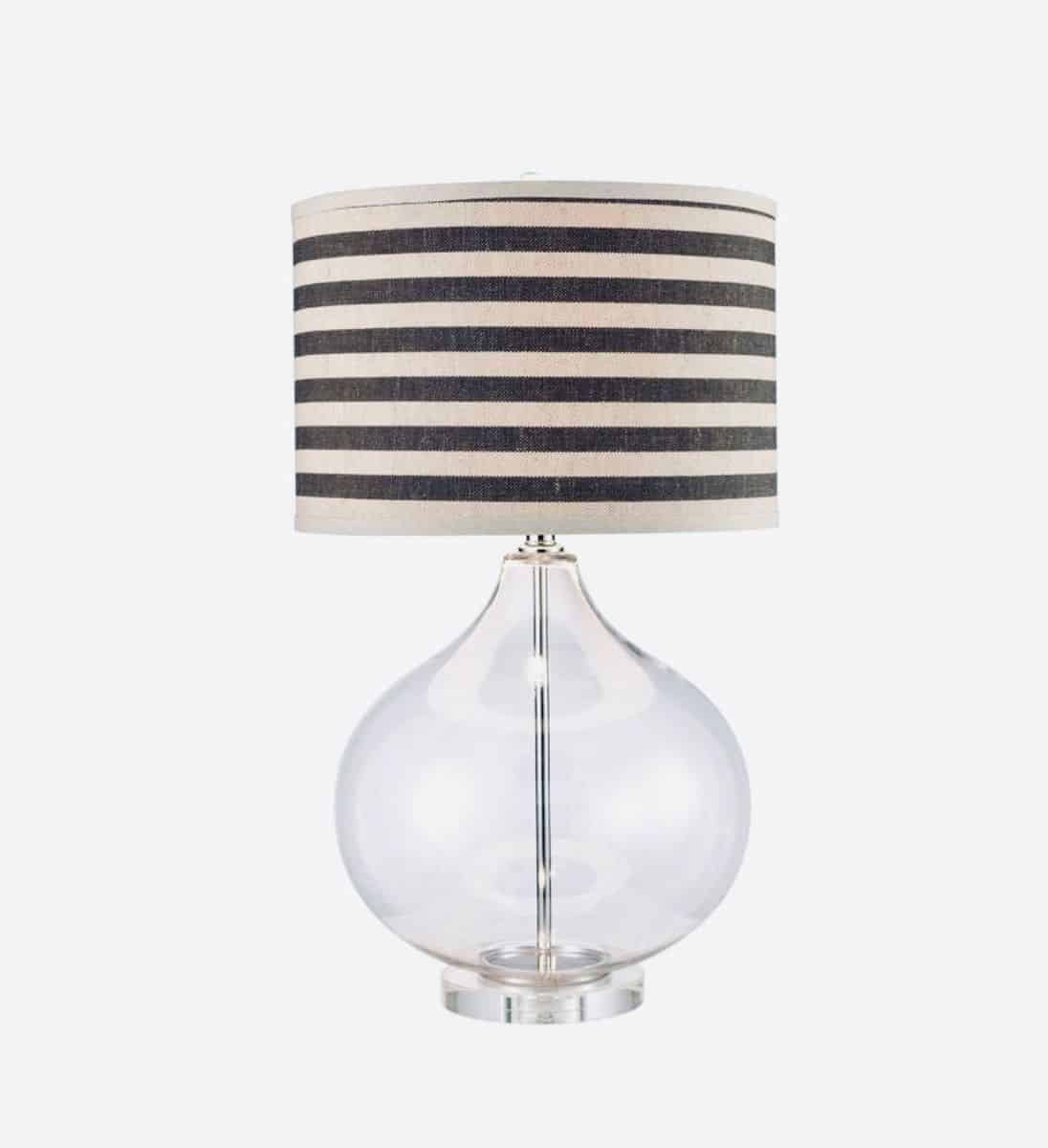 Round clear glass base with striking linen natural and black stripe lamp shade. Add something new and different to your decor.