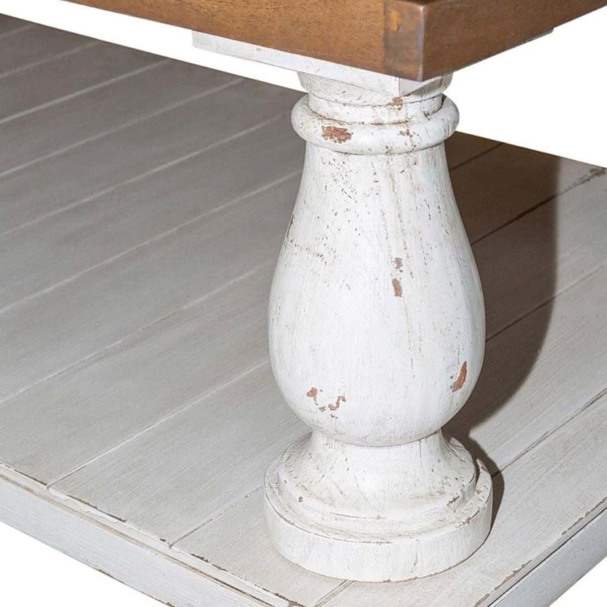 It offers a white base, bottom shelf, and wooden top It will work with a range of décor styles from coastal to classic country.