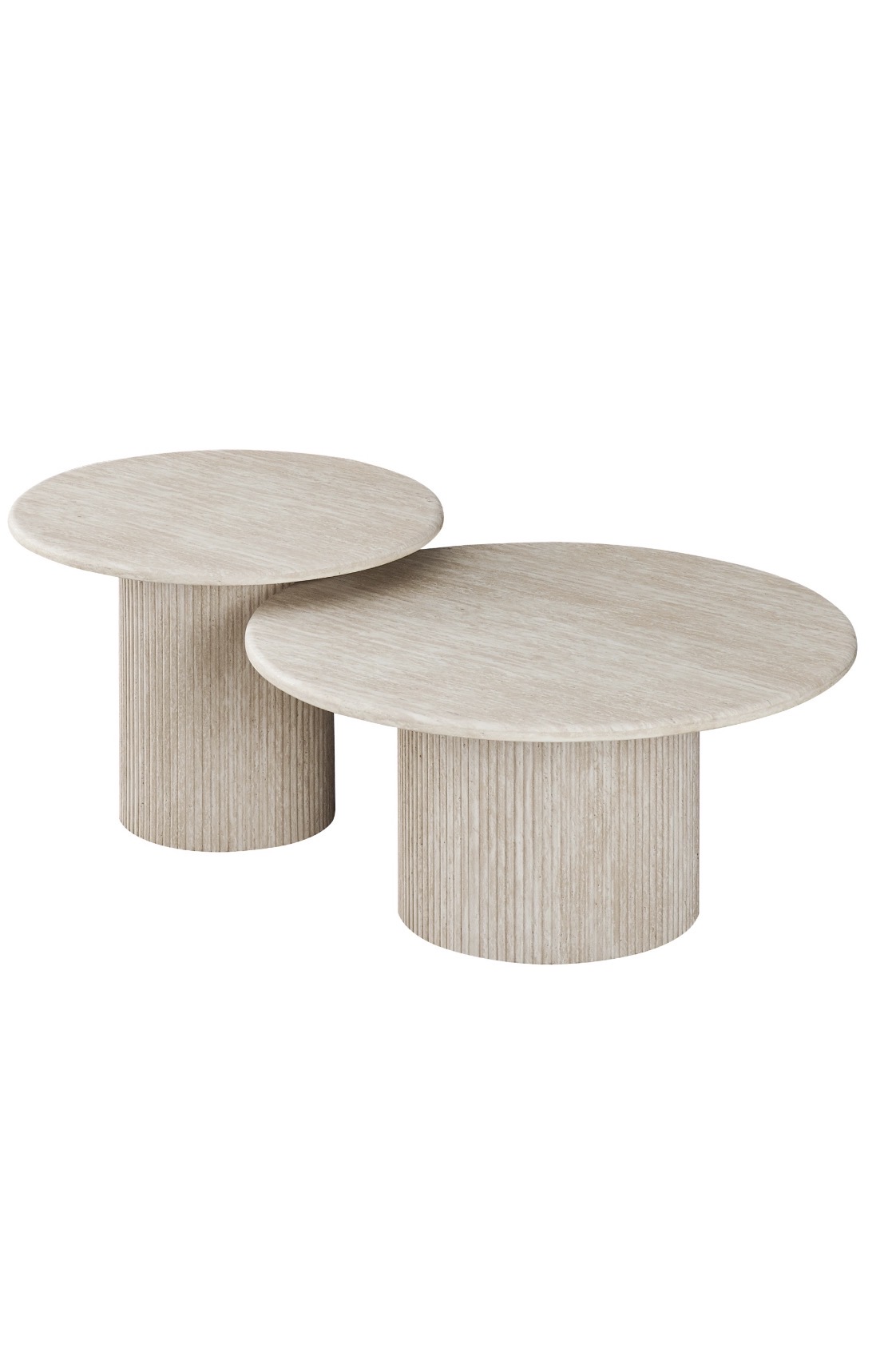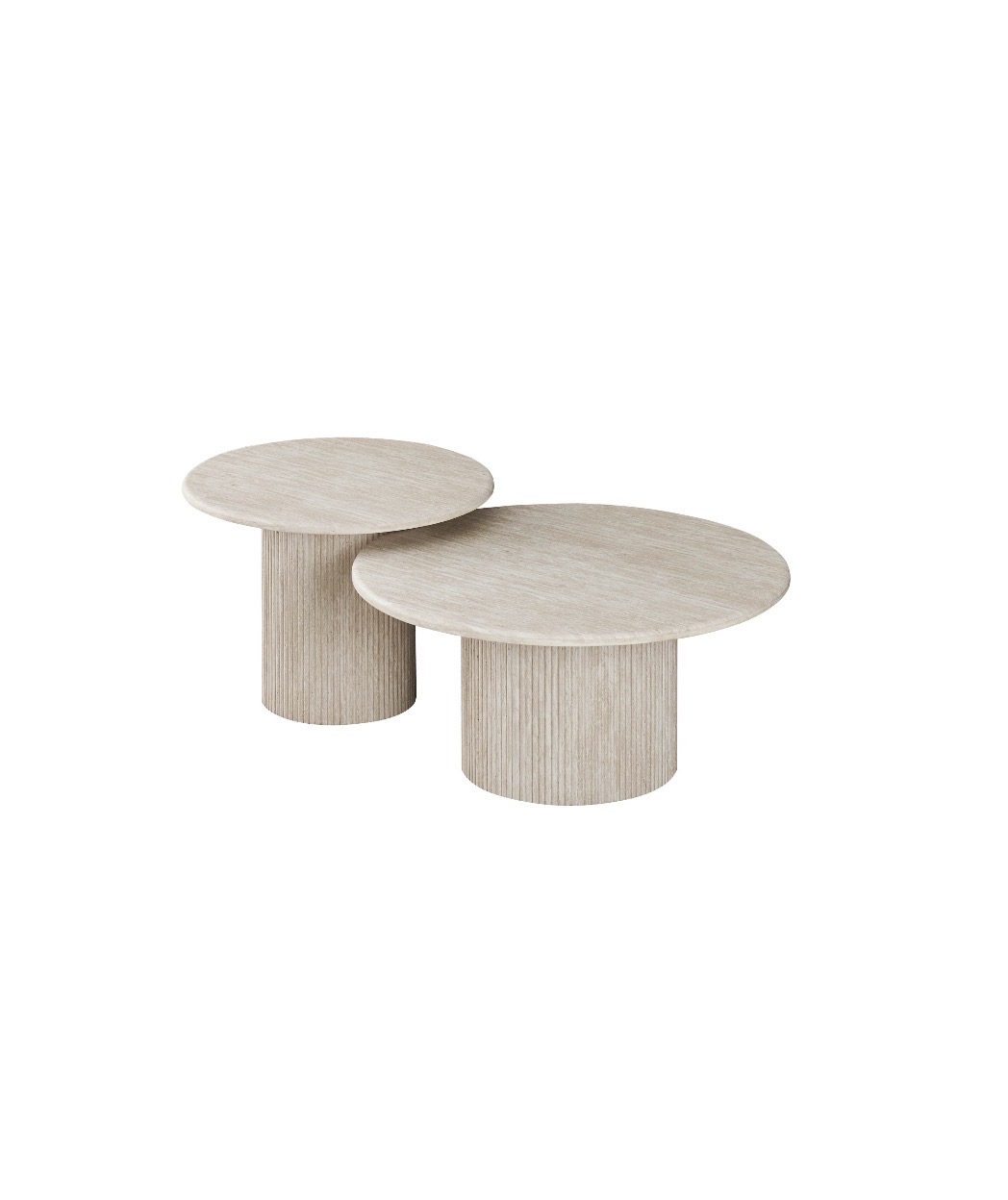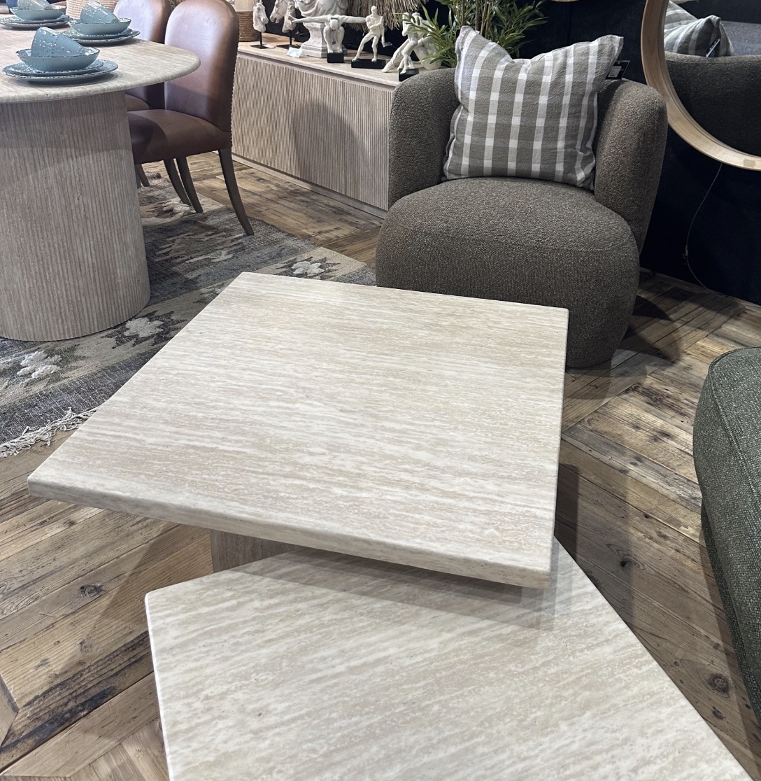Organic travertine style coffee tableswith a natural, uneven shape. Finished in a travertine overlay with marble accents, strong solid core highlighting unique stone textures. A versatile statement piece at an accessible price.
