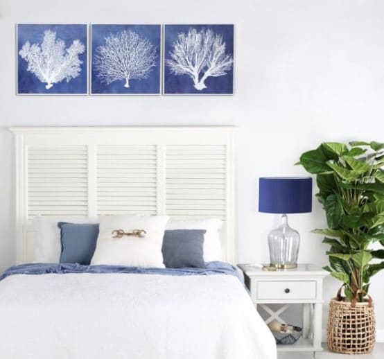 Navy blue and white coastal wall art. 3 different styles of bright white coral to freshen up any room for that hampton look.