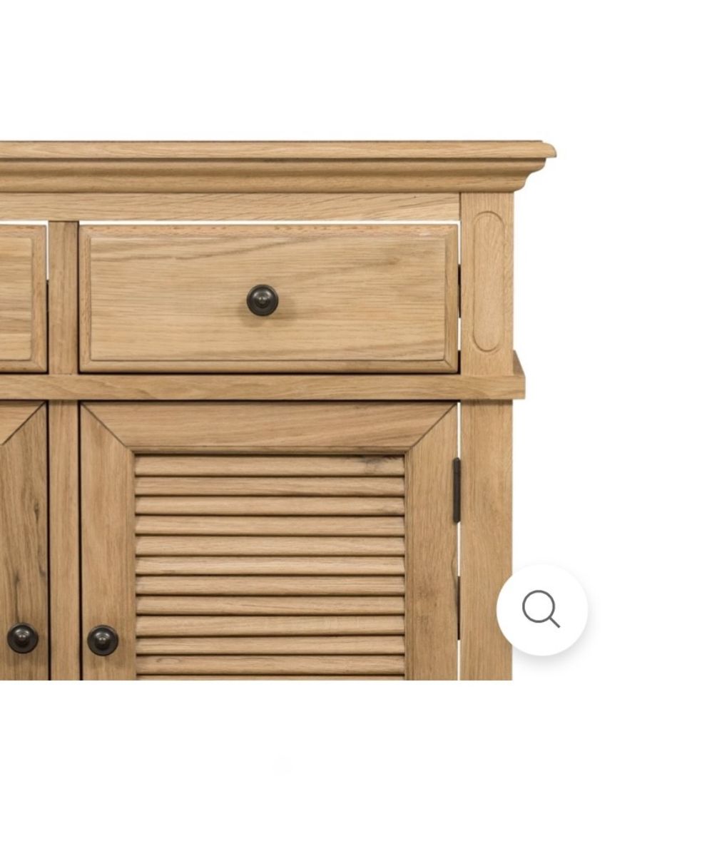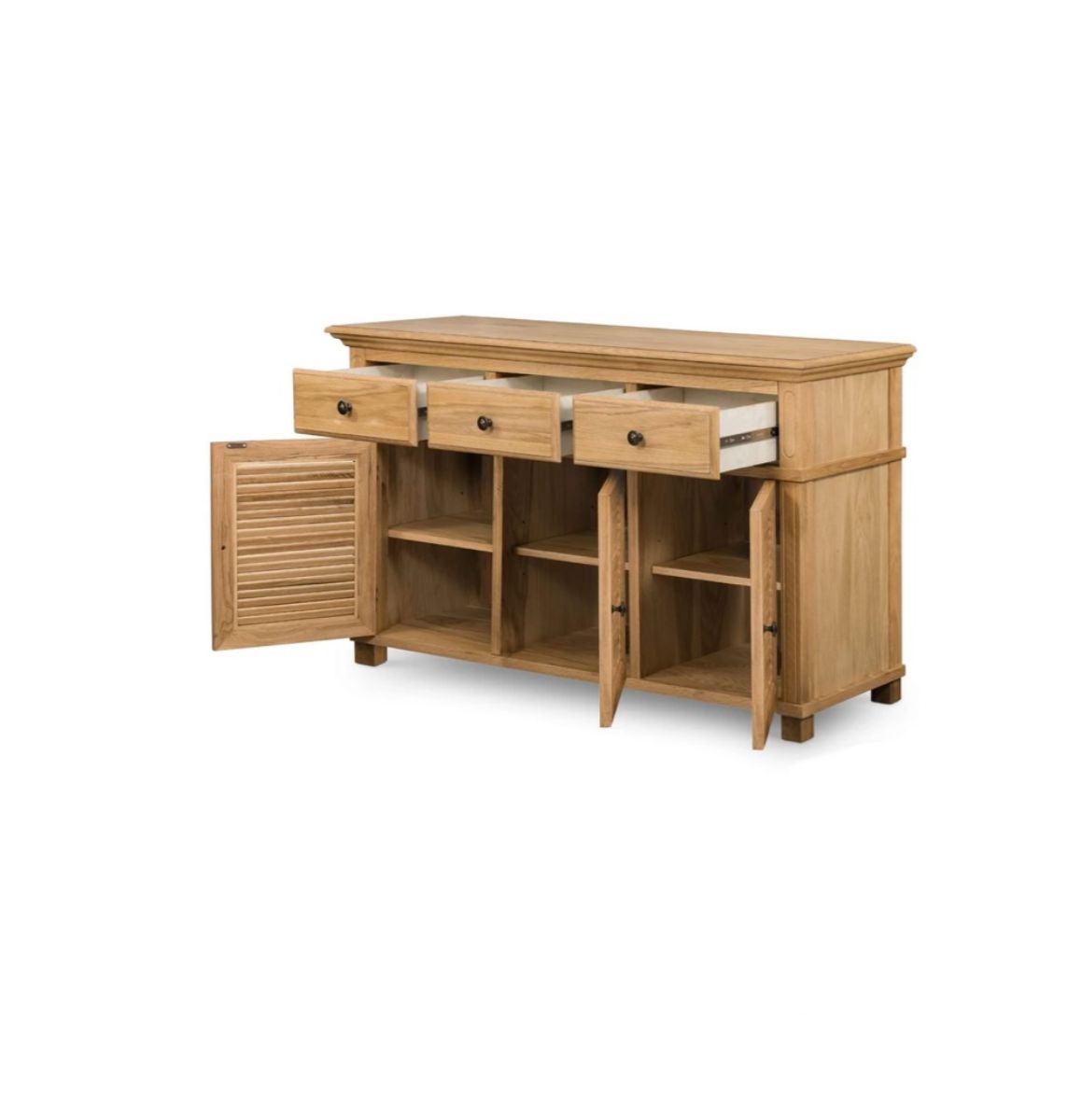 Hampton inspired wooden buffet with beautiful detailing. Great cupboards for extra storage and three draws on metal runners. Â Use this for a bedroom dresser,buffet,entertainment unit.
